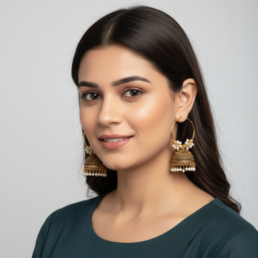 Discover the perfect balance of modern and traditional with these stunning hoop jhumka earrings. Featuring delicate pearl clusters on sleek gold hoops paired with intricately textured jhumka bells, these pieces redefine contemporary ethnic jewelry.